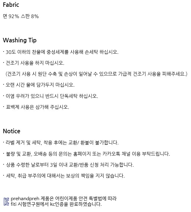 * 국가 인증기관에서 아동용 섬유제품 공급자 적합성 검사 확인 KC인증을 완료하였습니다.