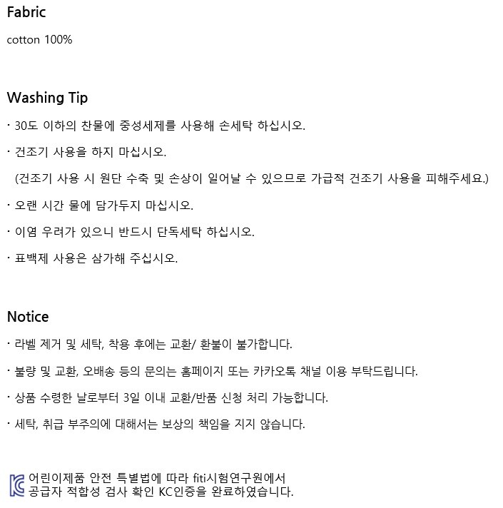 * 국가 인증기관에서 아동용 섬유제품 공급자 적합성 검사 확인 KC인증을 완료하였습니다.