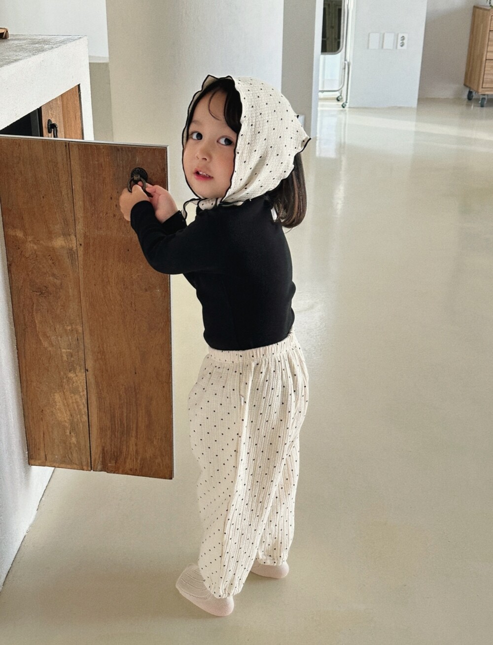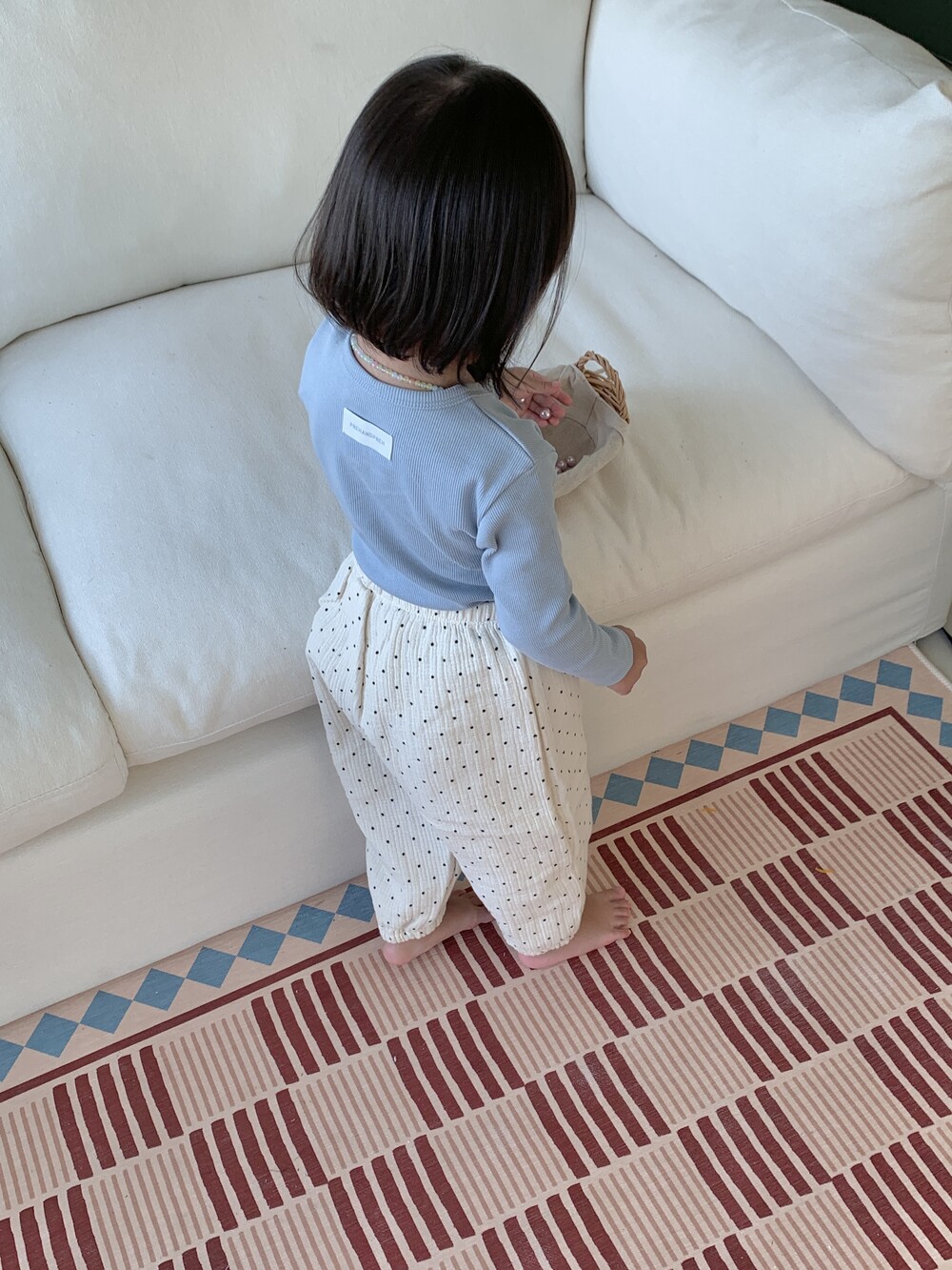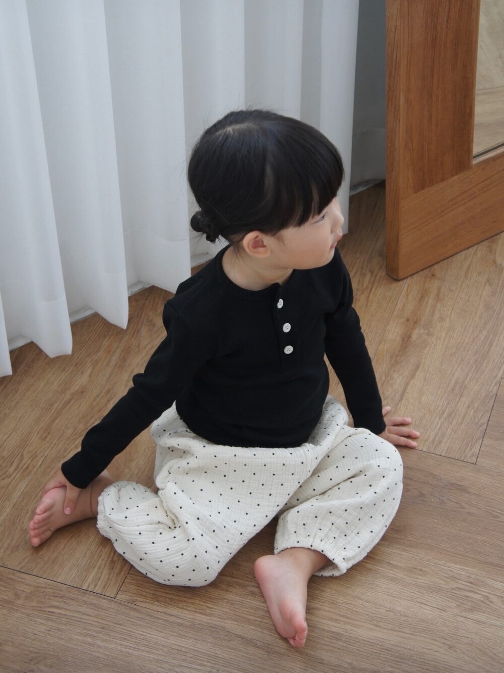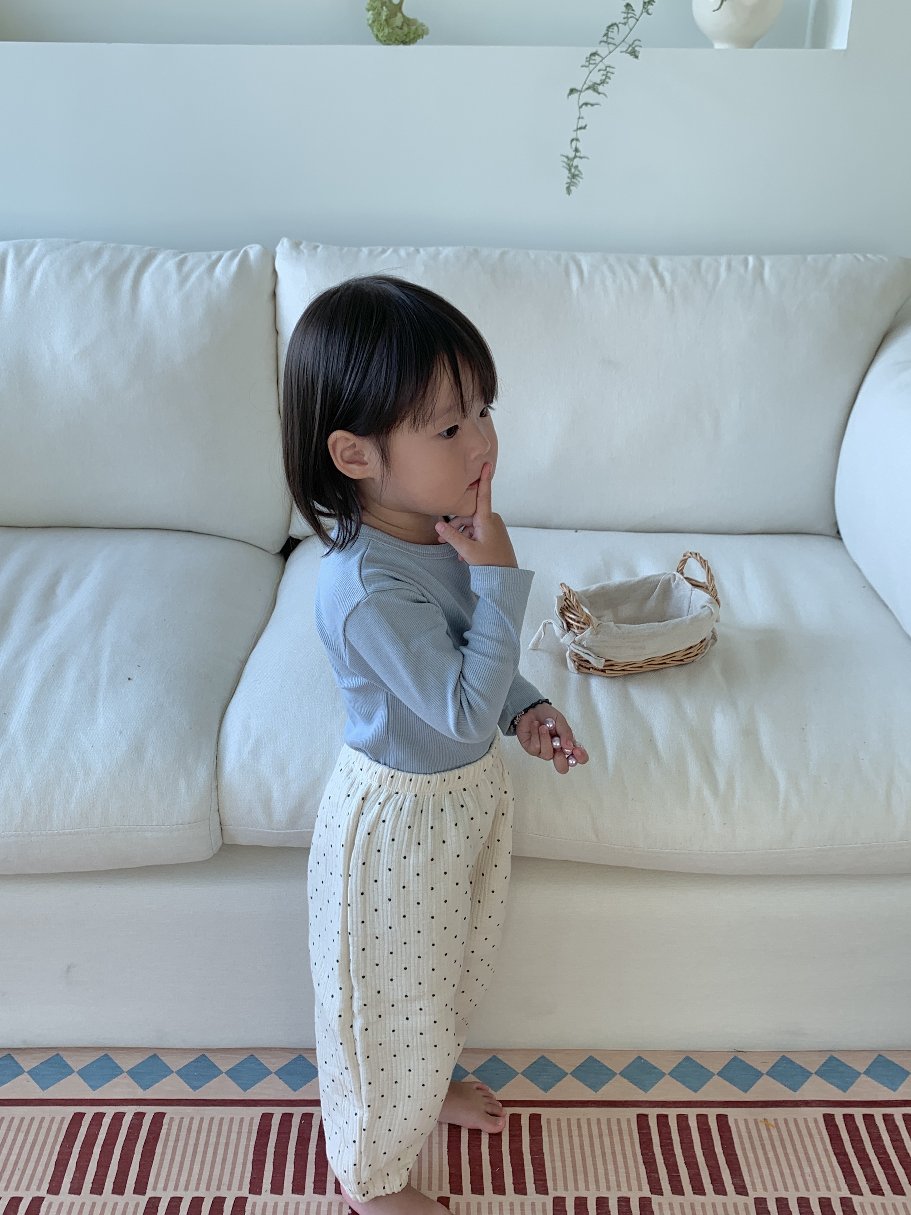 삼중 골지거즈소재로 톡톡한 질감이 돋보이는 도트 팬츠입니다.내구성이 좋아 데일리 아이템으로 활용하기 좋습니다. 국내에서 생산된 삼중 골지거즈에 은은한 도트 패턴을 더해 특별함을 담았으며, 사계절용으로 한여름과 한겨울을 제외하고 착용하기 적합합니다. 부드럽고 편안한 착용감과 적당히 볼륨있는 핏이 귀엽게 연출 됩니다.