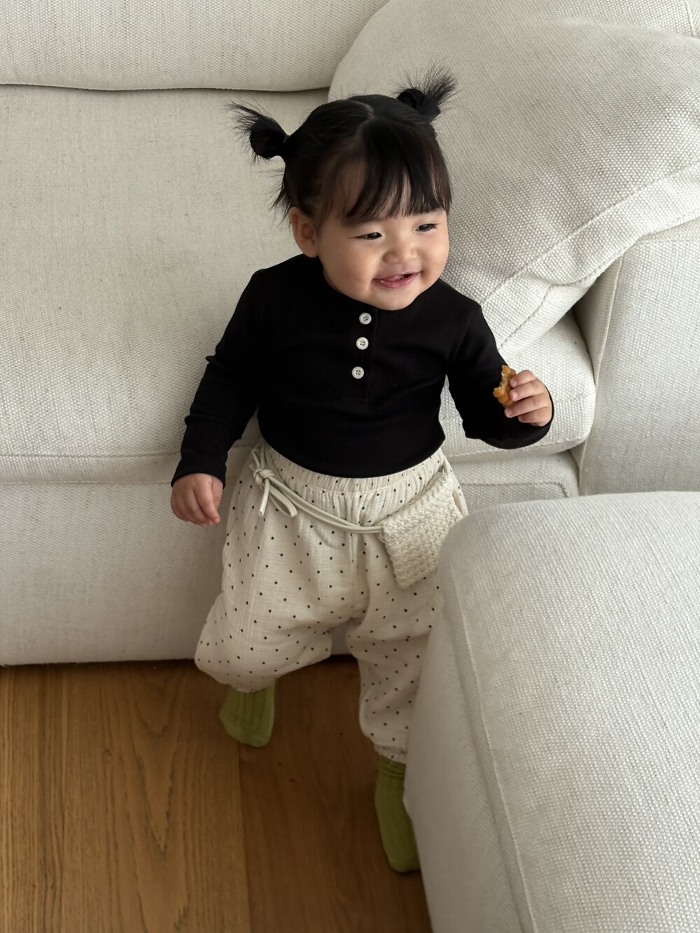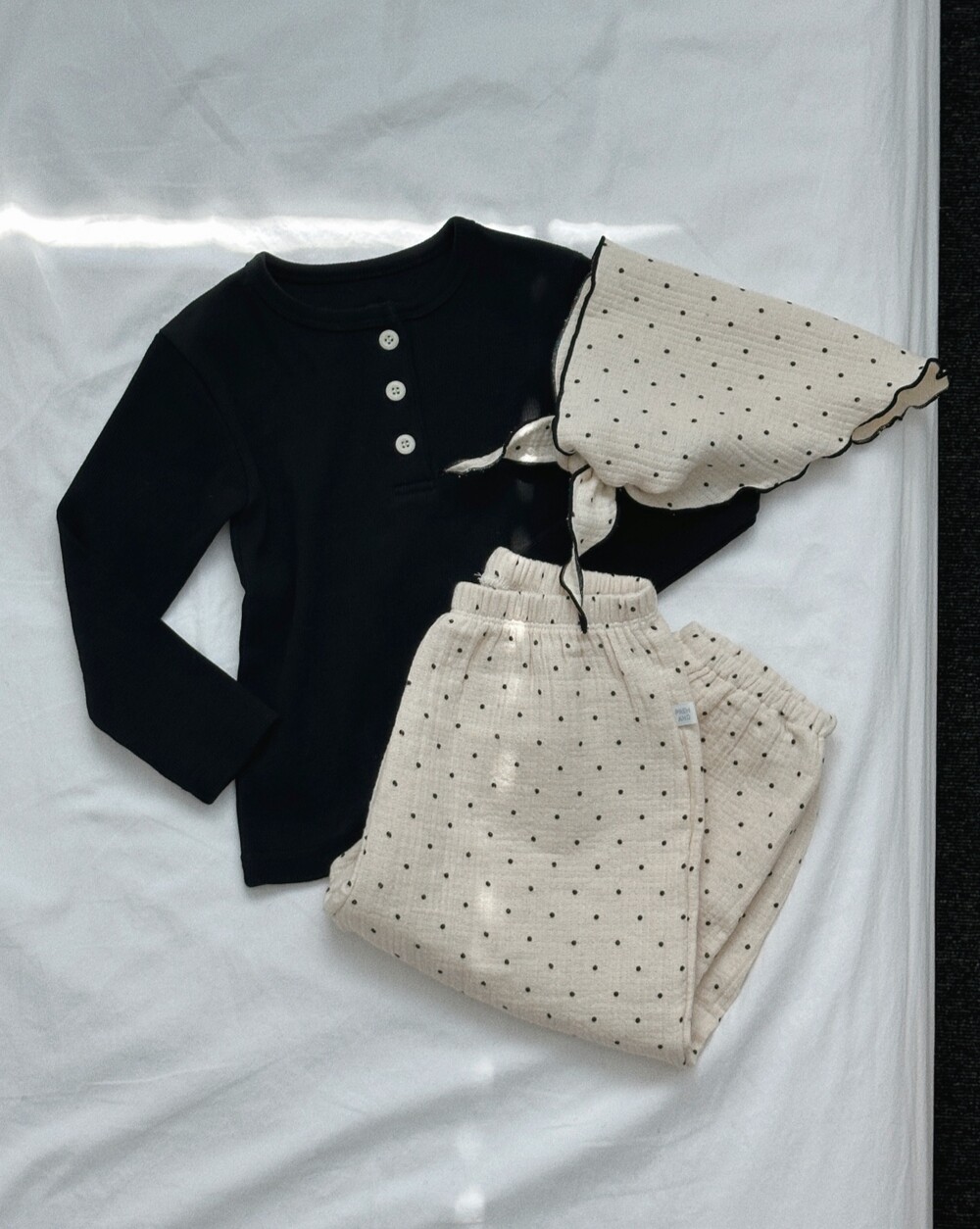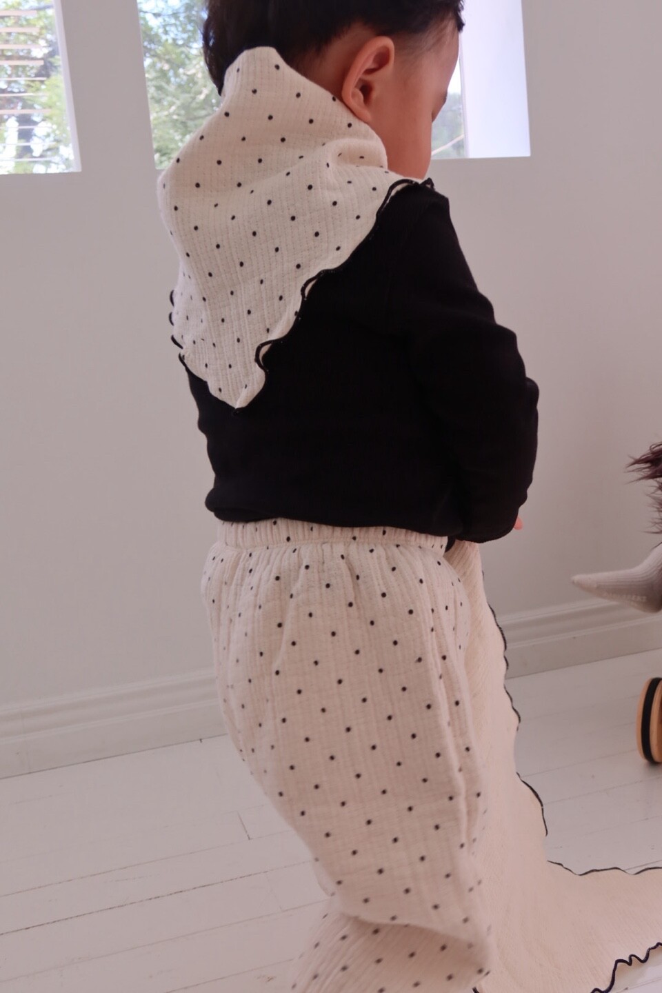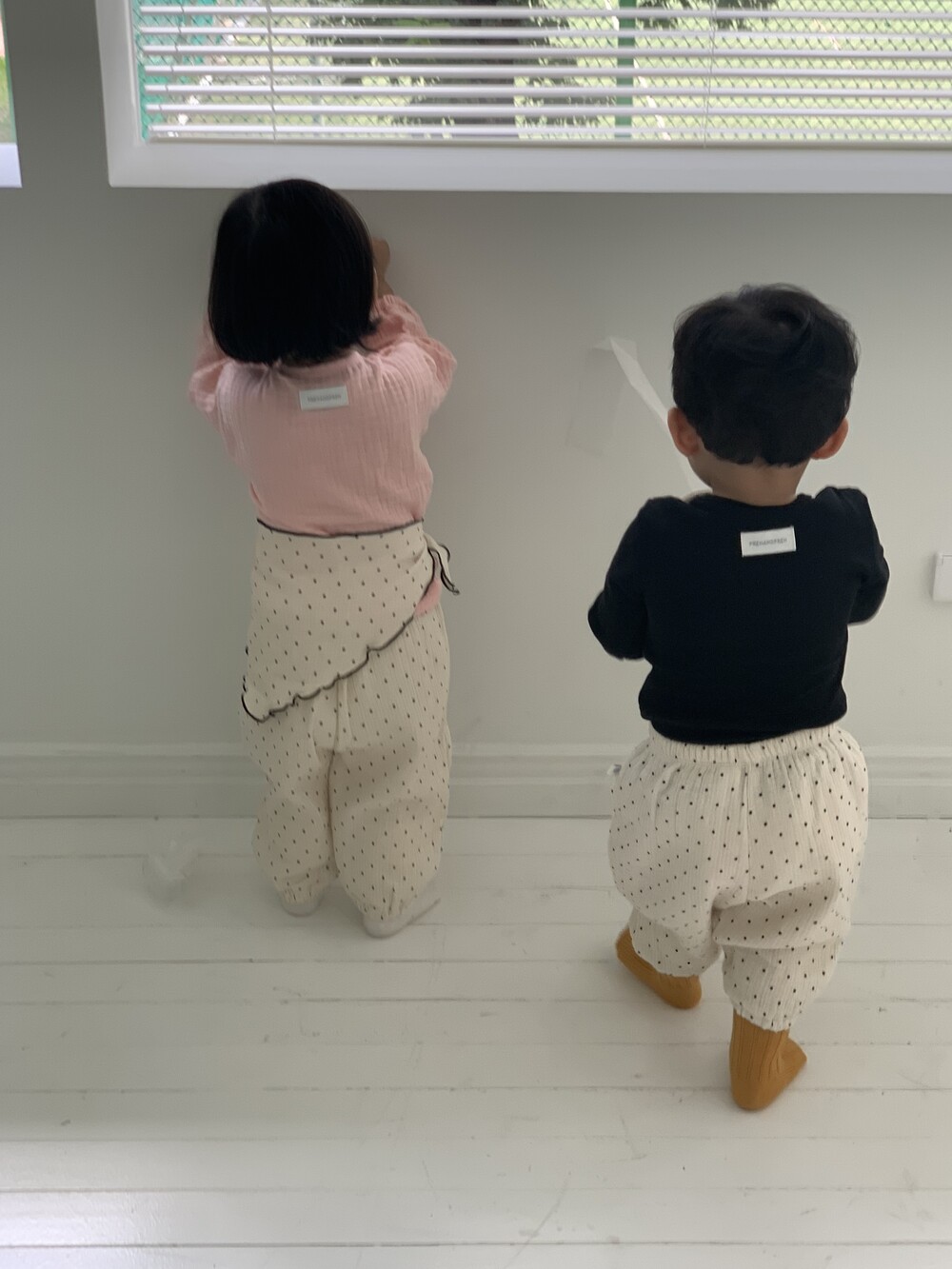 삼중 골지거즈소재로 톡톡한 질감이 돋보이는 도트 팬츠입니다.내구성이 좋아 데일리 아이템으로 활용하기 좋습니다. 국내에서 생산된 삼중 골지거즈에 은은한 도트 패턴을 더해 특별함을 담았으며, 사계절용으로 한여름과 한겨울을 제외하고 착용하기 적합합니다. 부드럽고 편안한 착용감과 적당히 볼륨있는 핏이 귀엽게 연출 됩니다.